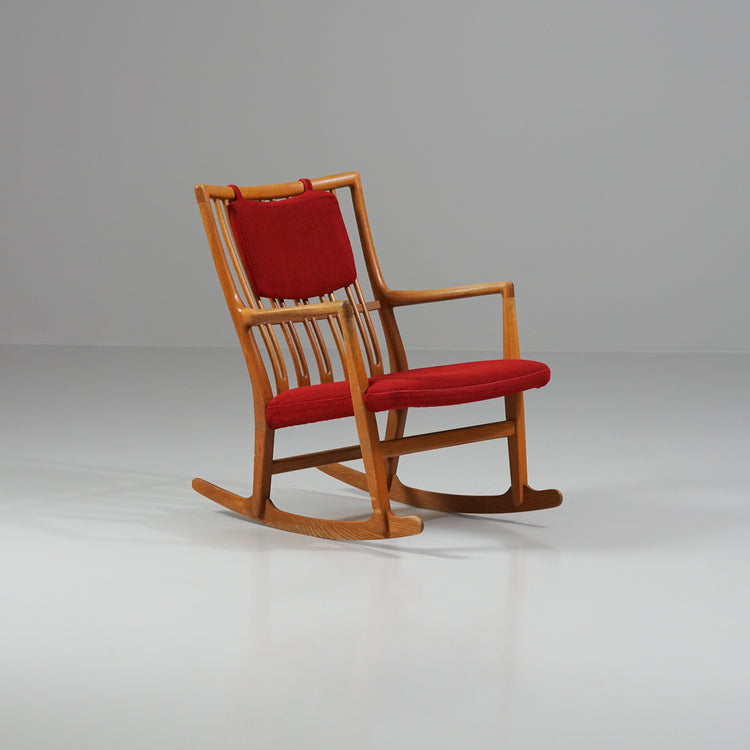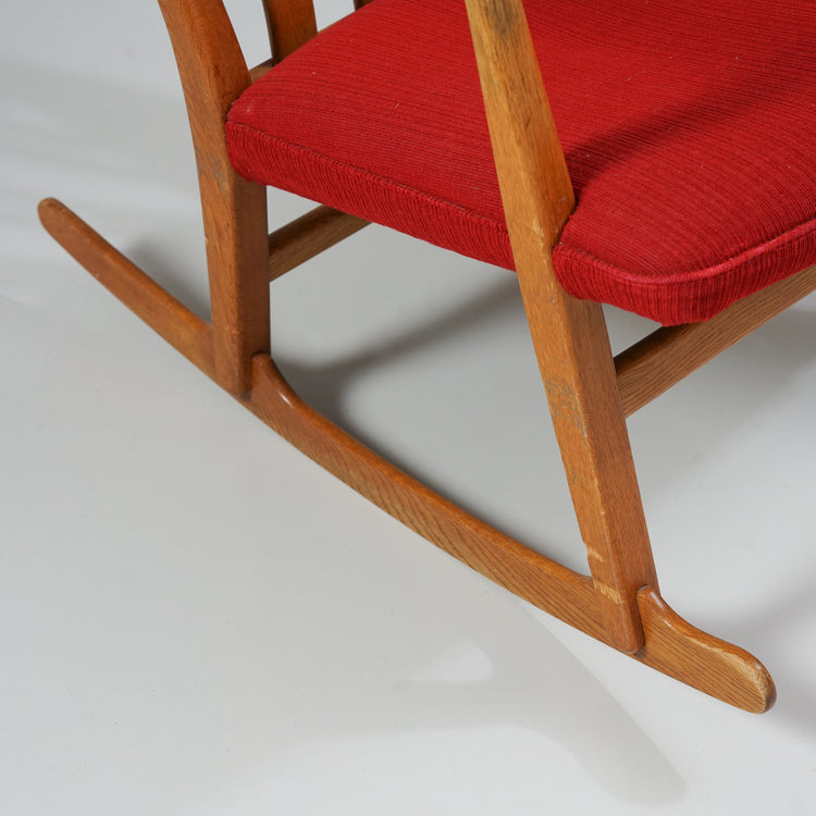 Rocking chair model ML-33, design Hans J Wegner, manufactured by Mikael Larsen, Denmark, 1950/1960s. Oak frame, original fabric upholstery. Good vintage condition, patina and minor wear consistent with age and use.