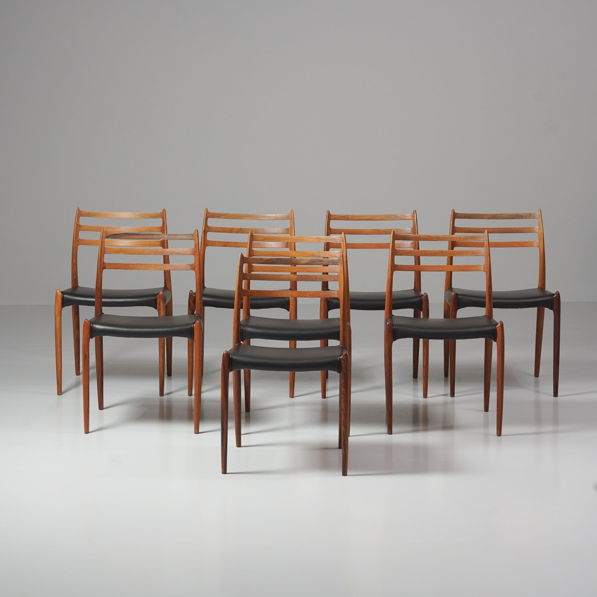 Model 78 dining chairs (8 pieces sold together), designed by Niels Møller, manufactured by JL Møller, Denmark, 1950/1960s. Rosewood frame, reupholsterd quality leather seats. Marked. Good vintage condition, minor patina consistent with age and use. The chairs are sold together as a set. The price indicated is the price for the set.
