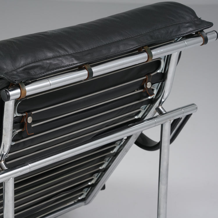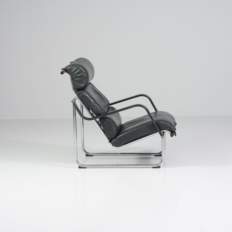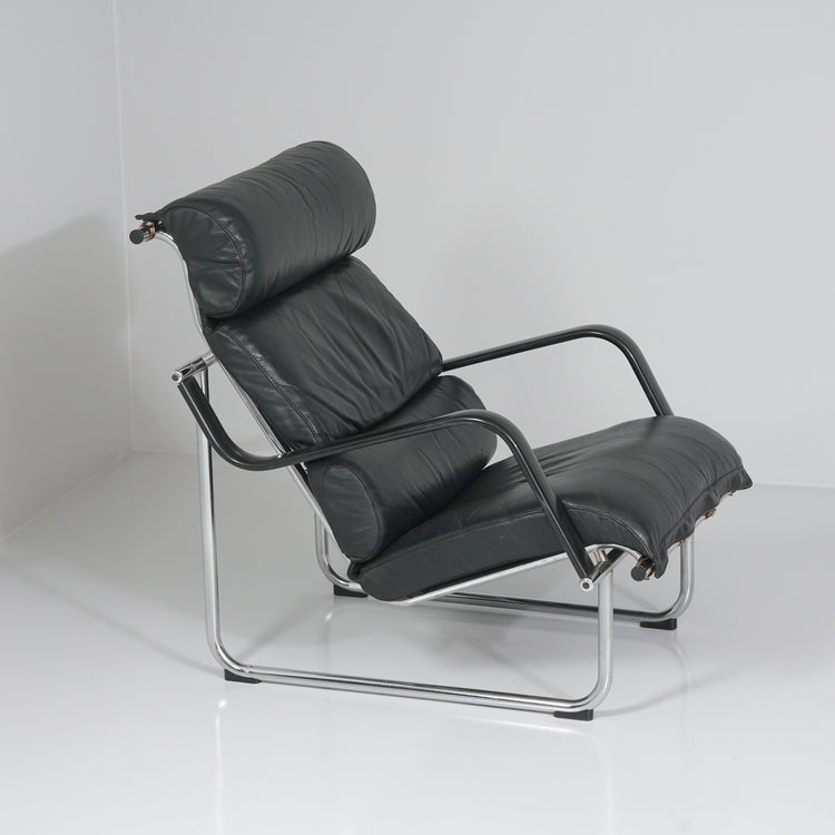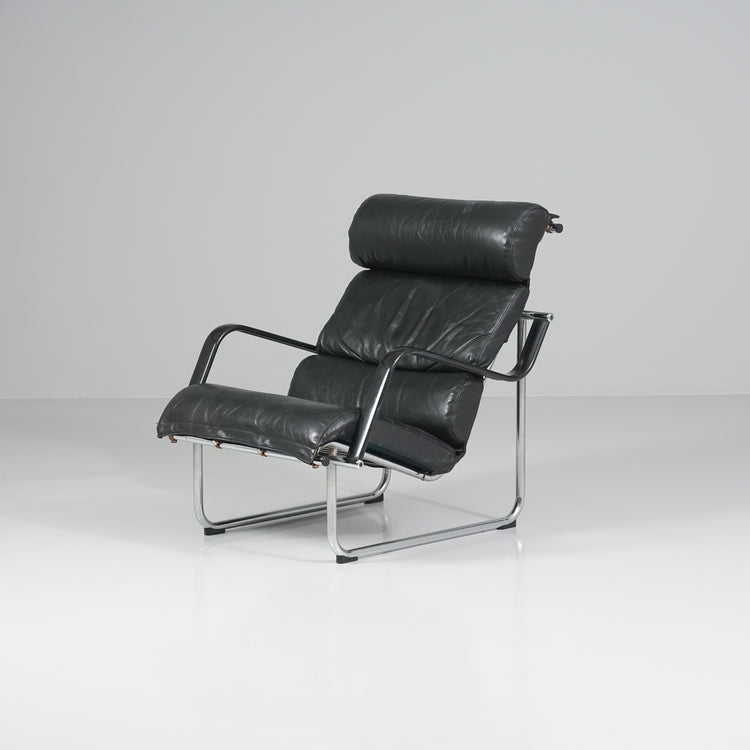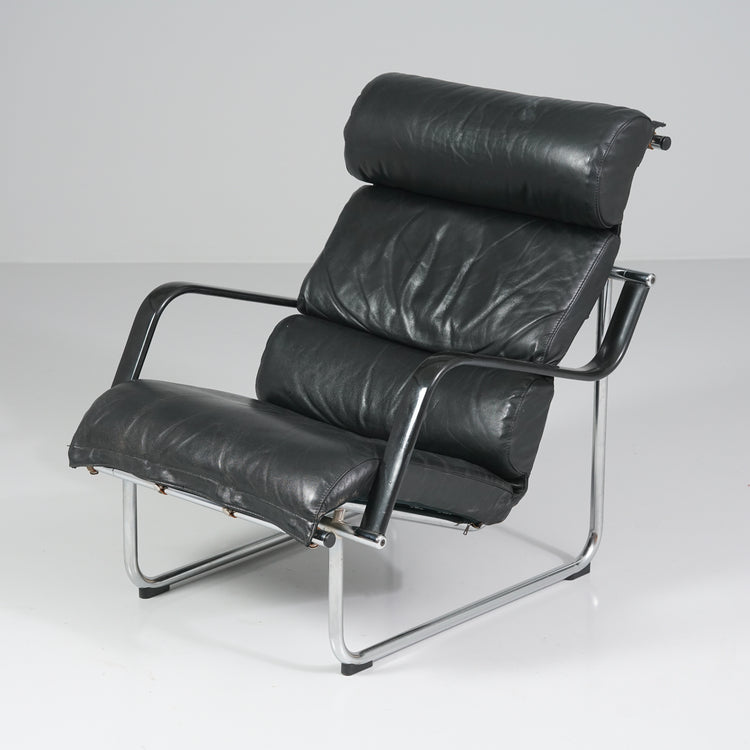Model "Remmi" armchair, designed by Yrjö Kukkapuro, manufactured by Haimi, 1970s. Chromed frame, original leather upholstery. Good vintage condition, minor patina consistent with age and use.
