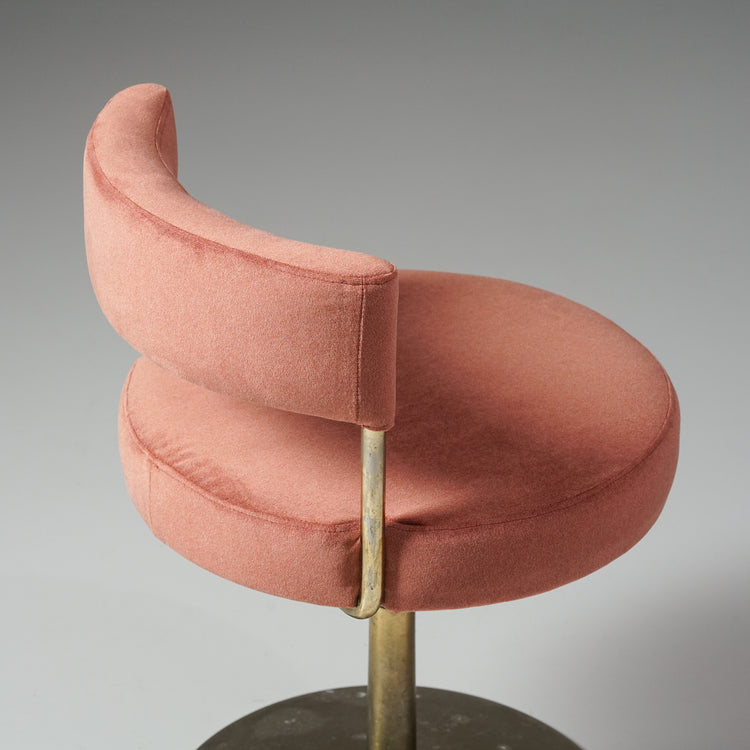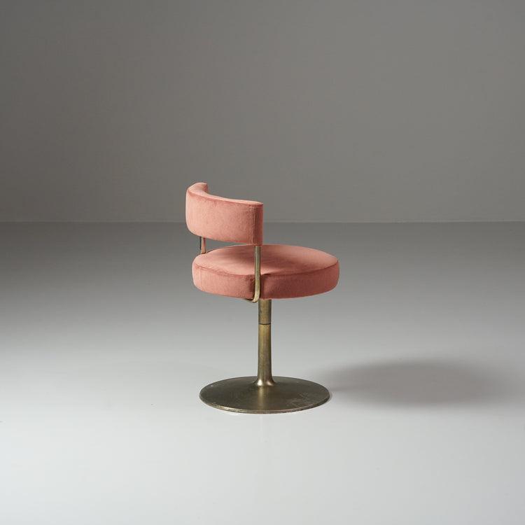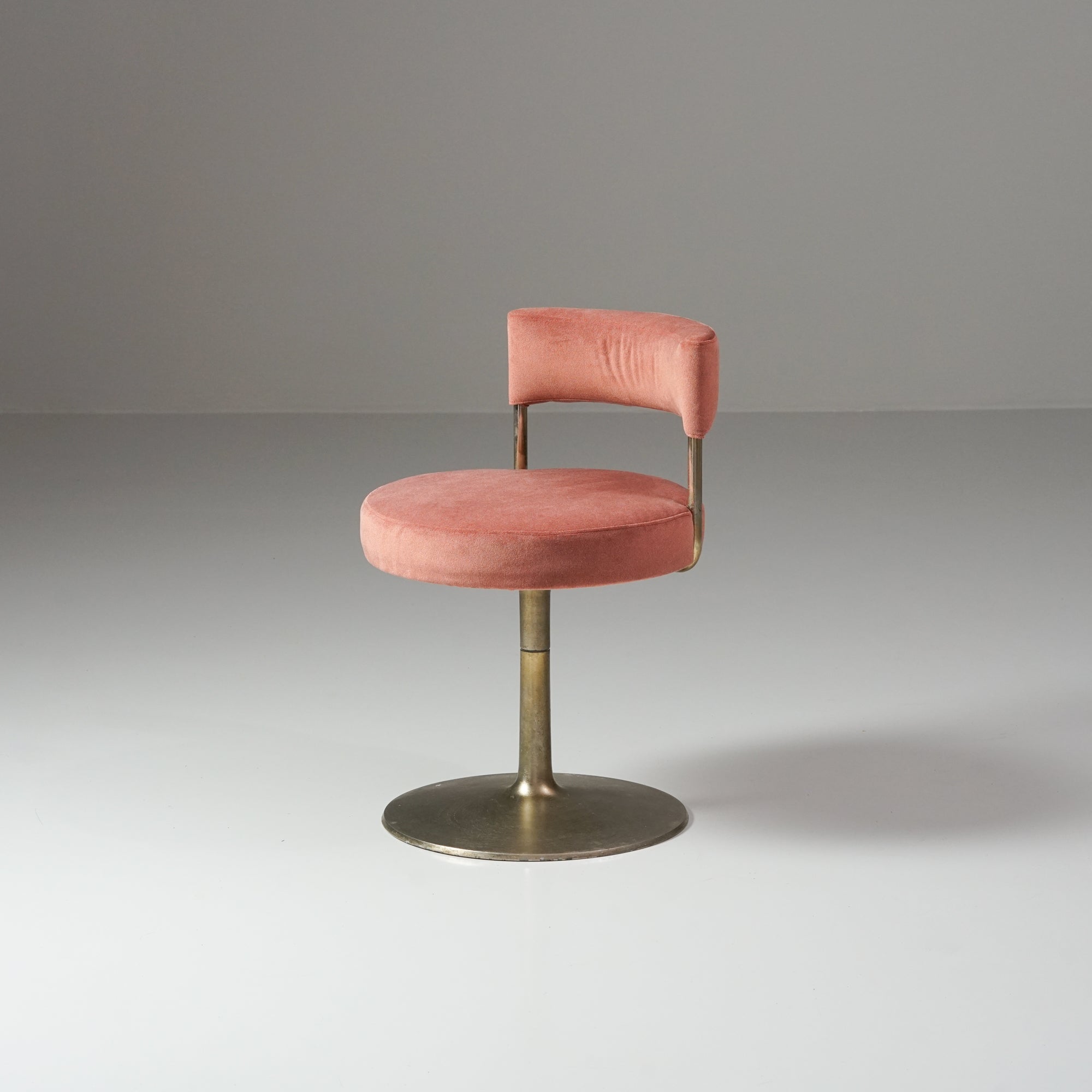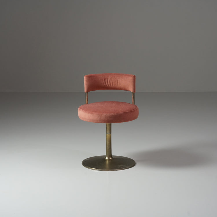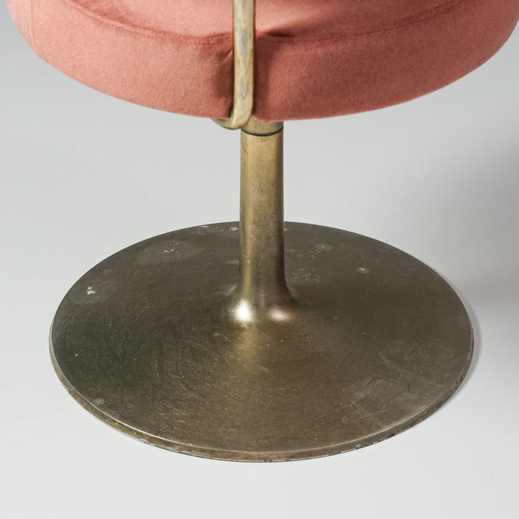 Pyörivä lounge tuoli (8 kpl myydään erikseen), 70-luku. Uudelleen verhoiltu laadukkaalla Lauritzonin "Baby Velour" -kankaalla. Messinkisoitu metallirunko. Hyvä kunto, ajan patinaa rungossa. Tuolit myydään erikseen. Ilmoitettu hinta on kappalehinta. Tuoleissa 2-3 viikon toimitusaika. Tuoleja saatavilla tarpeen mukaan lisää.