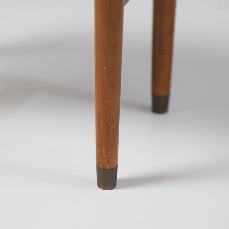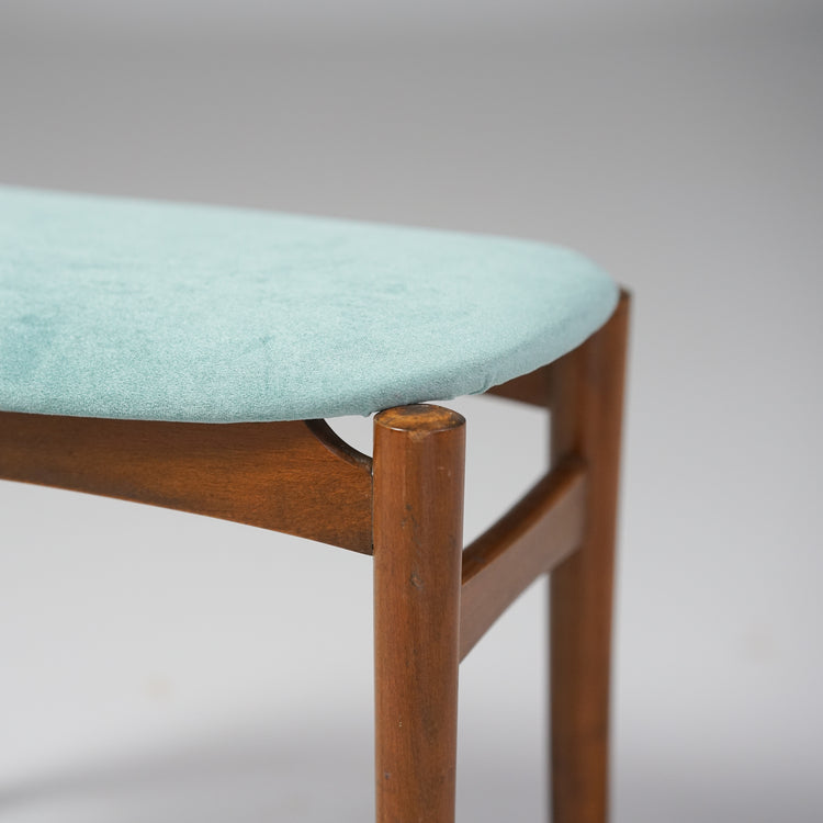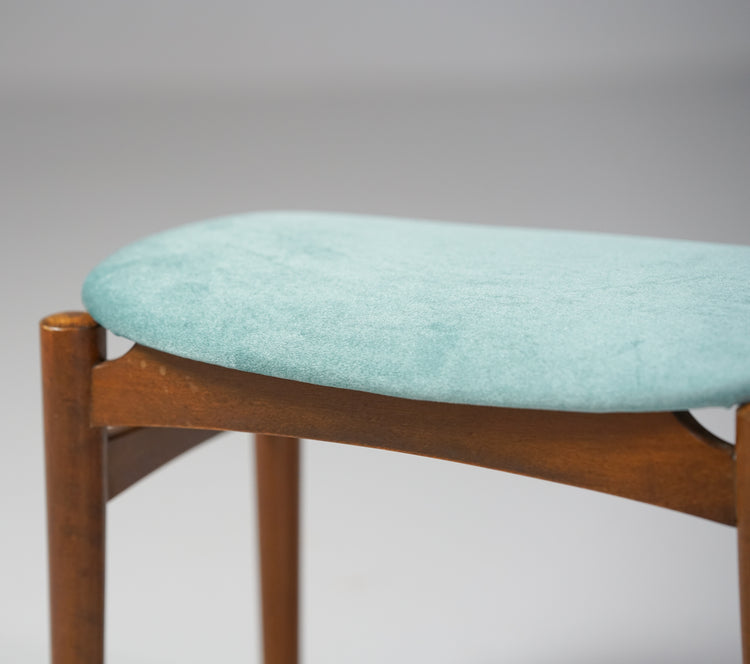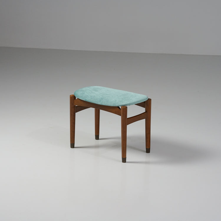 Stool, manufactured in Denmark, 1960s. Teak frame, brass details, reupholstered with quality Baby Velour- fabric by Lauritzon. Good vintage condition, patina consistent with age and use.