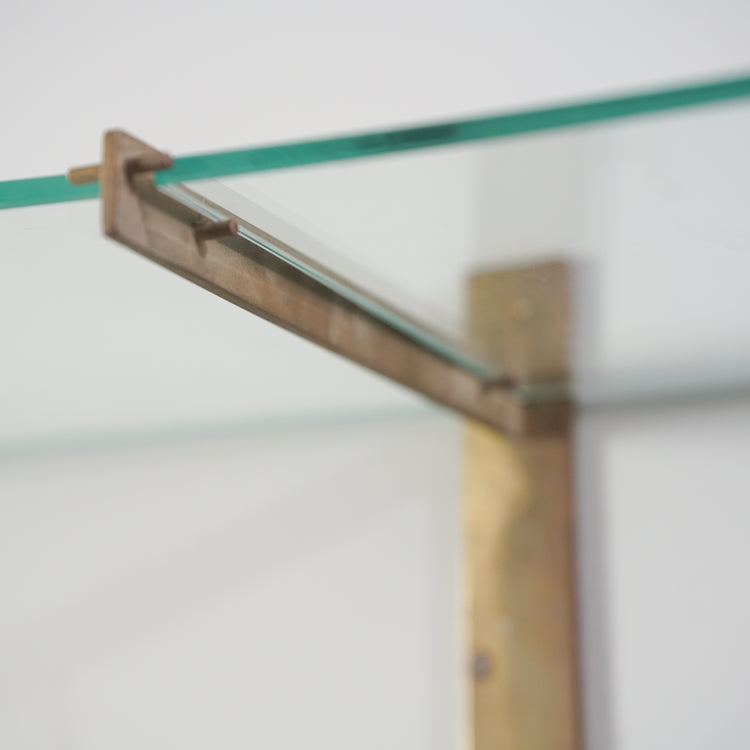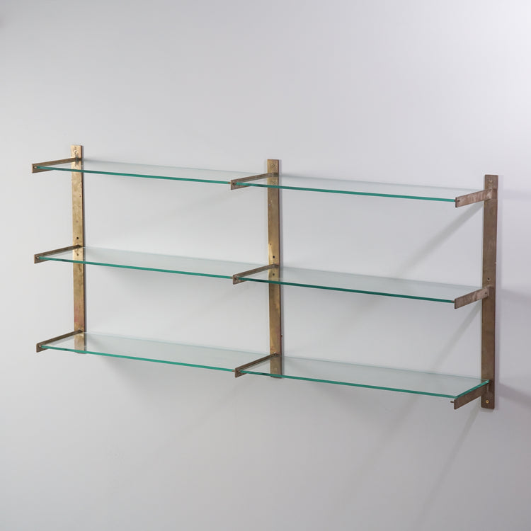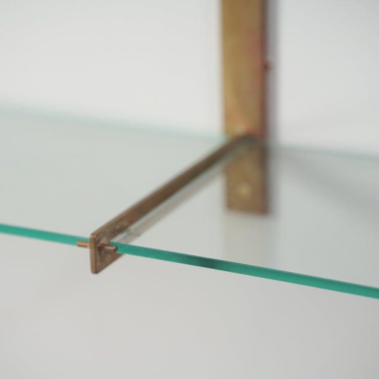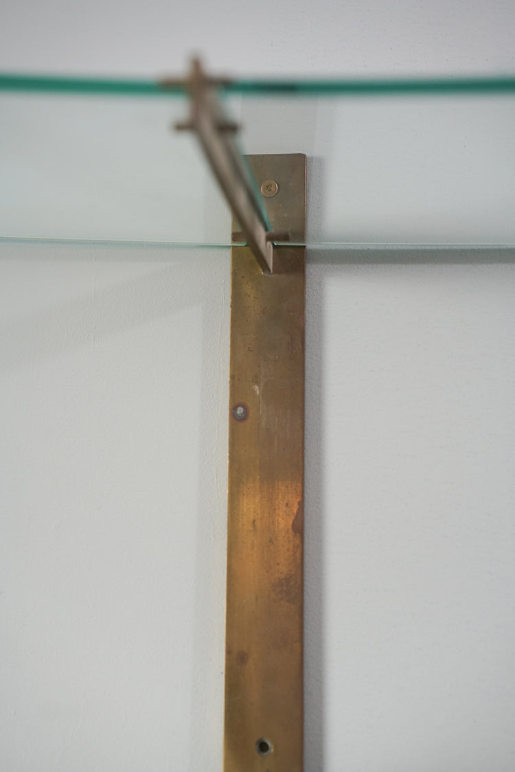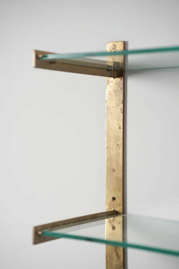 Harvinainen seinähylly, design Ahti Taskinen, 60/70-luku. Messinki runko, lasiset hyllyt. Hyvä kunto, ajan patinaa.