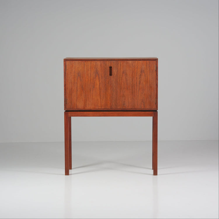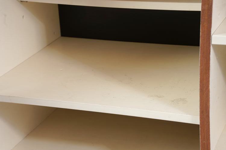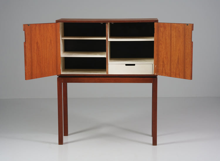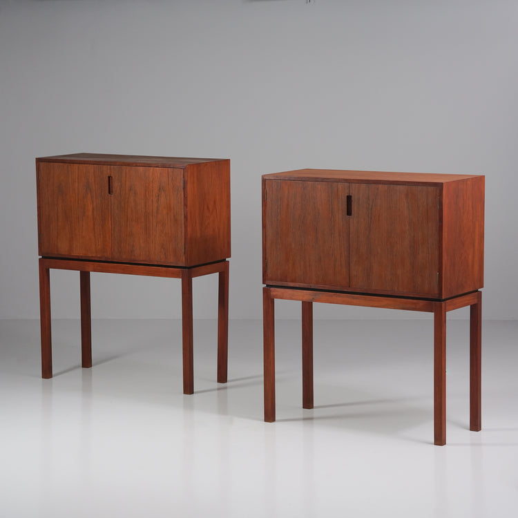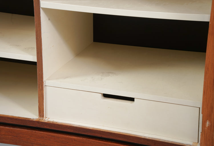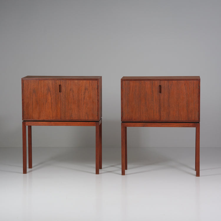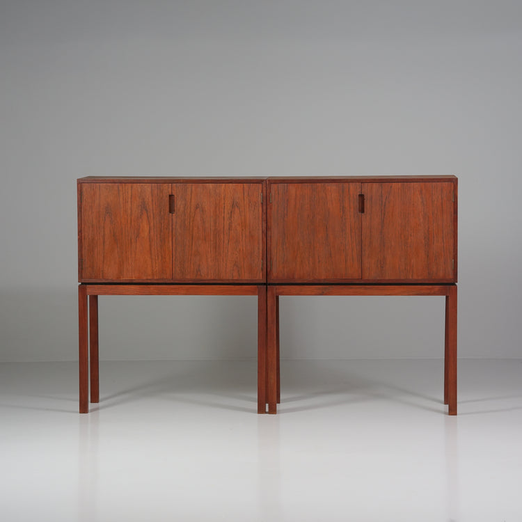 Pair of cabinets, manufactured in Finland, 1960s. Teak. Inside the cabinet is painted white. Adjustable shelf height. Both cabinets have a pull out drawer. Refinished. Good vintage condition, patina consistent with age and use.