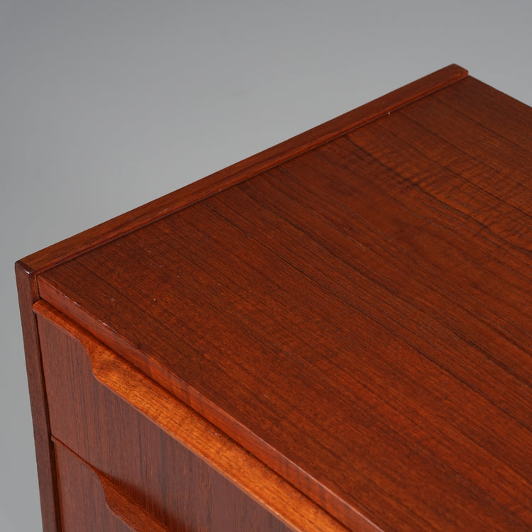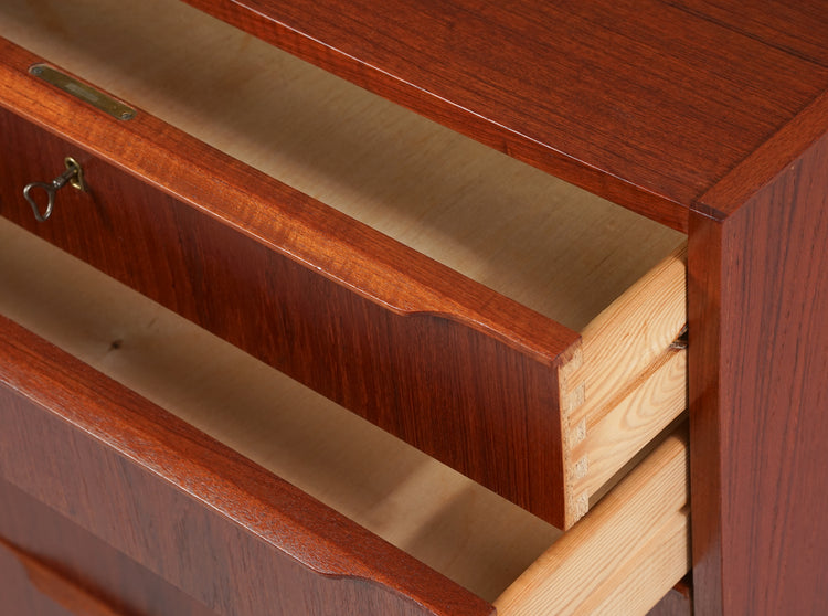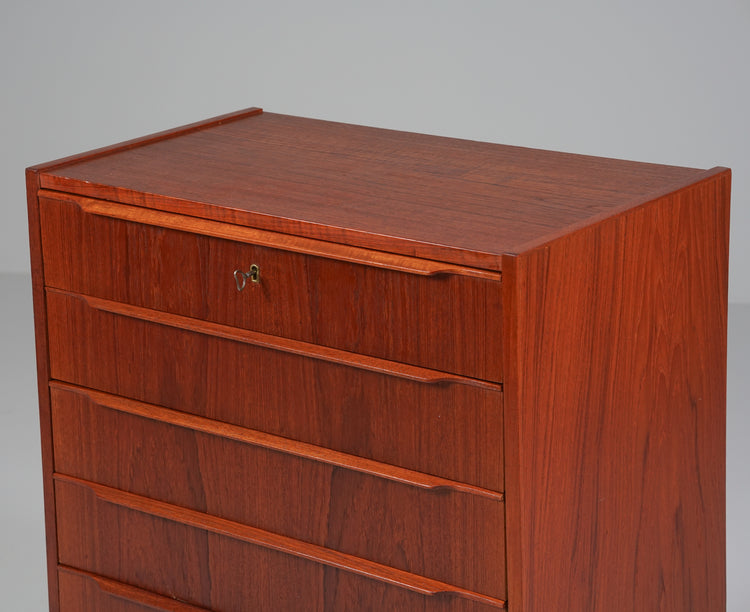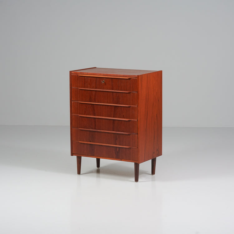 Laatikosto, valmistettu Tanskassa, 60-luku. Tiikkiä. Ylimmän laatikon saa lukkoon avaimella. Hyvä kunto, ajan patinaa.