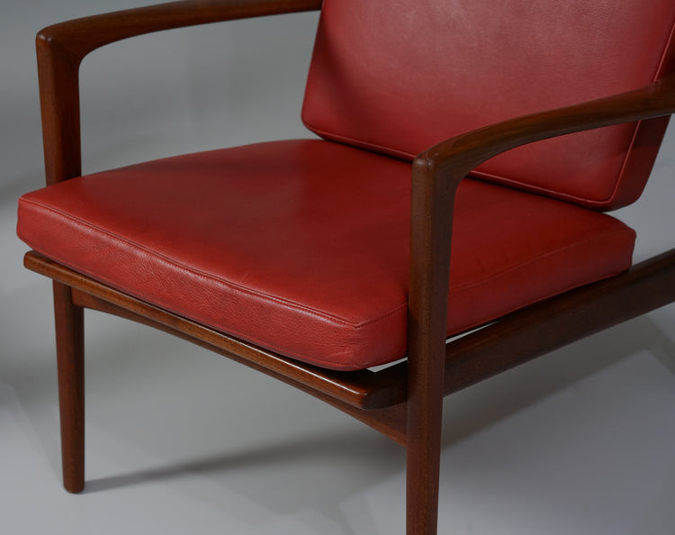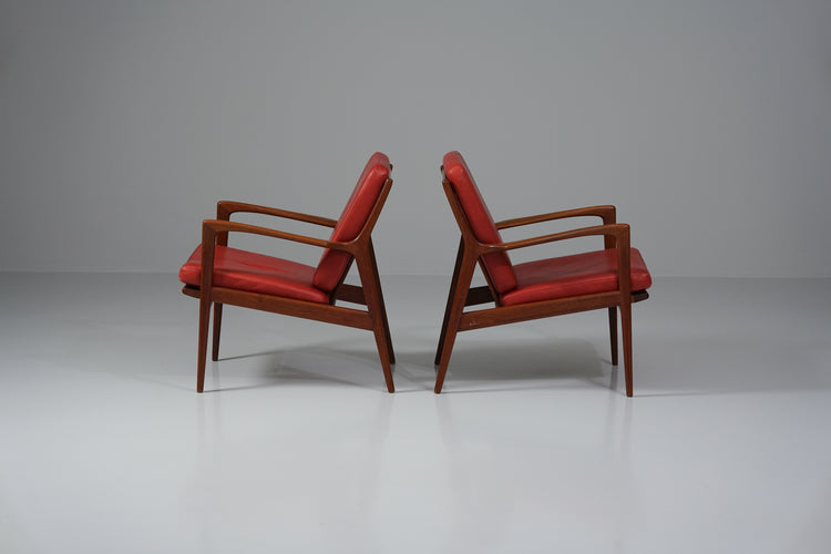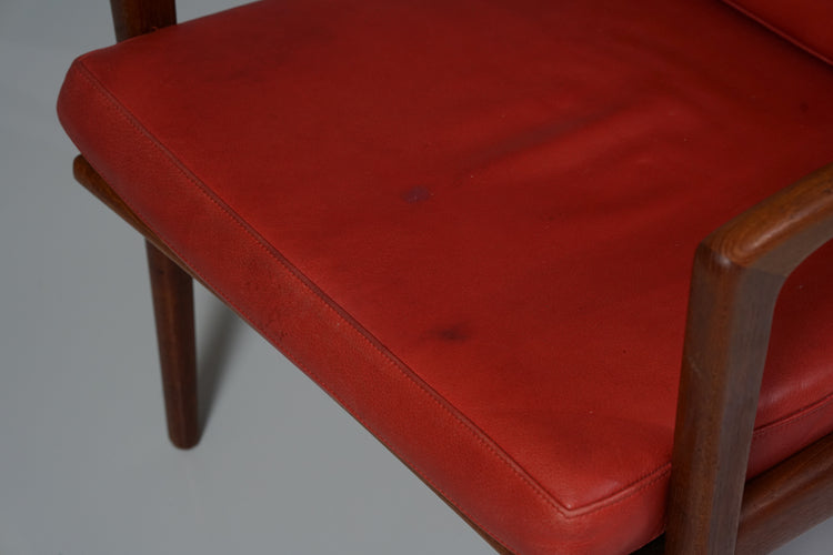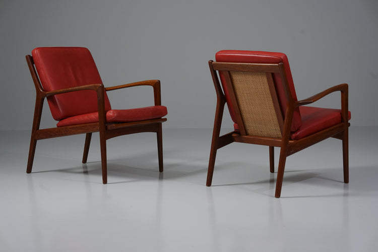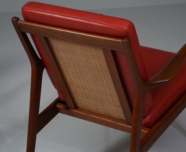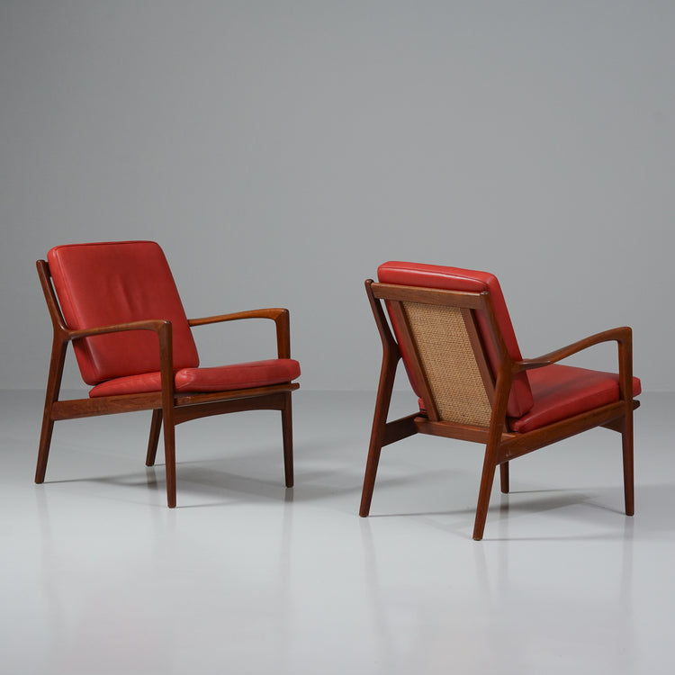 Pair of armchairs, designed by Karl Erik Ekselius, manufactured by JOC möbler Vetlanda, Sweden, 1960s. Teak frame, gorgeous rattan weaving on the backrest. Red leather upholstery. Great vintage condition, patina and minor wear on the leather, see photos.