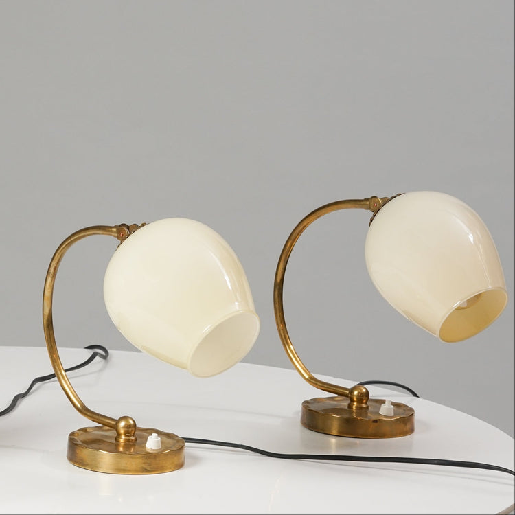 Table-/wall light set (four pieces in total sold together), designed by Paavo Tynell, manufactured by Idman, 1950s, brass, opaline glass shade, marked. Good vintage condition, minor patina consistent with age and use. The lights are sold together. The listed price is for the set.