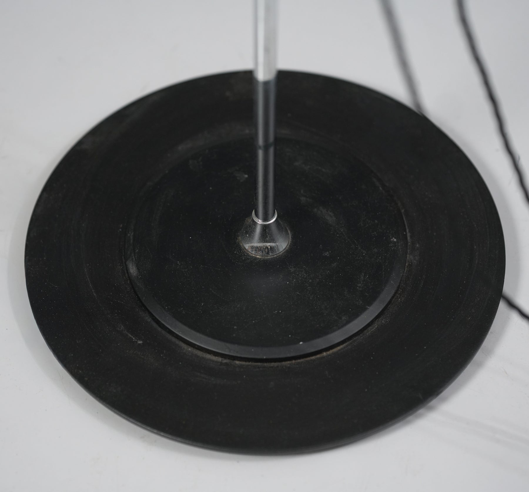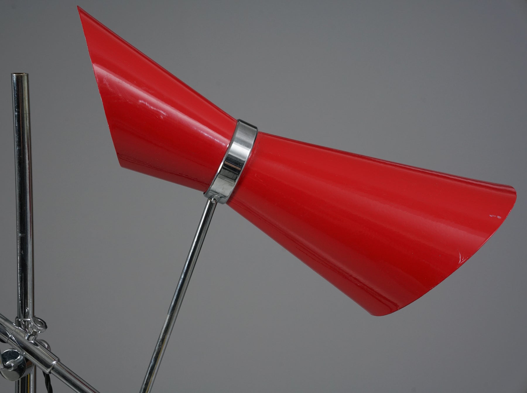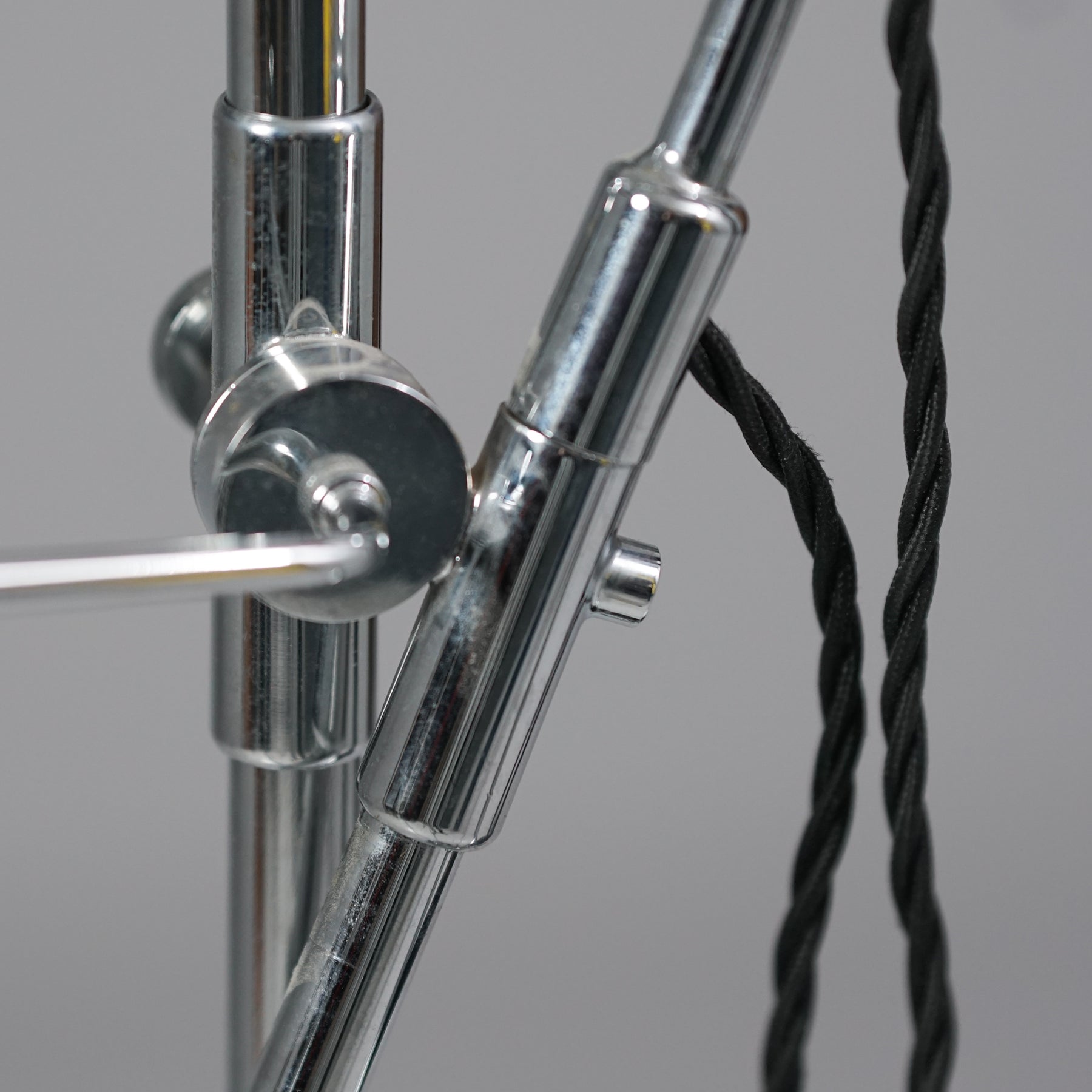 Stilnovo -tyylinen lattiavalaisin, Italia, 80/90-luku. Rautaa ja kromattua metallia. Neljä säädettävää valaisinosaa. Leimattu. Hyvä kunto, ajan patinaa.