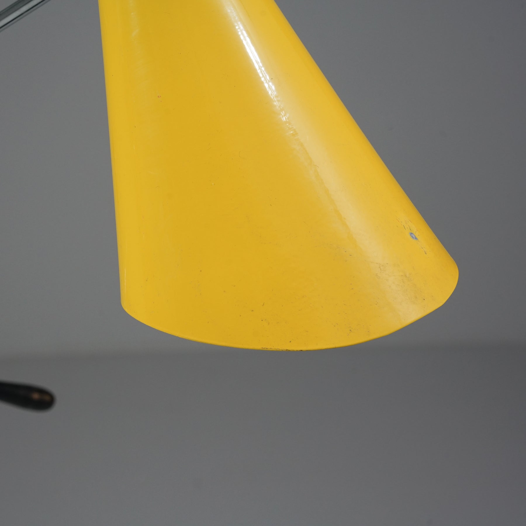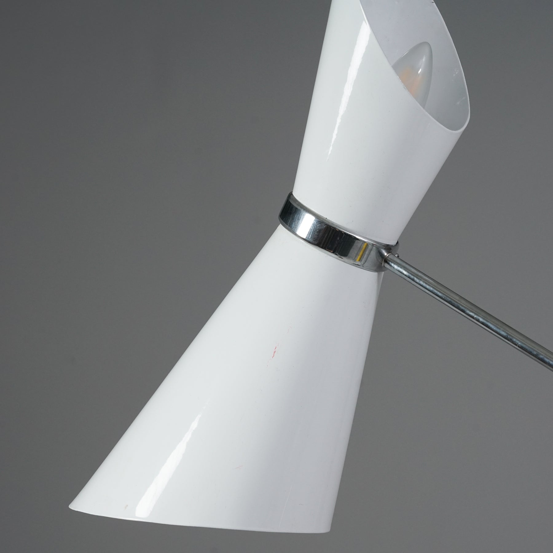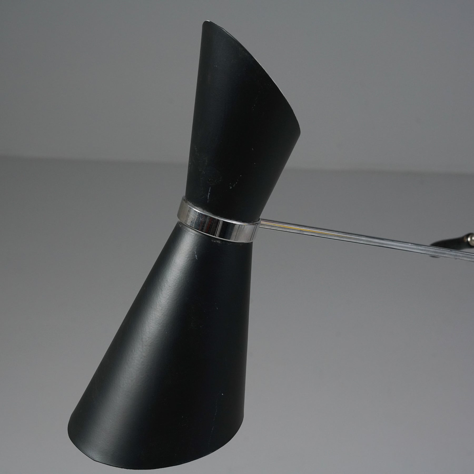Stilnovo -tyylinen lattiavalaisin, Italia, 80/90-luku. Rautaa ja kromattua metallia. Neljä säädettävää valaisinosaa. Leimattu. Hyvä kunto, ajan patinaa.