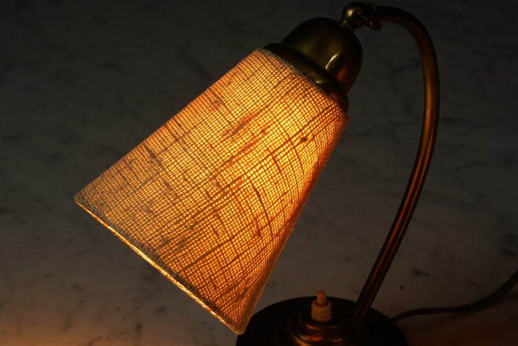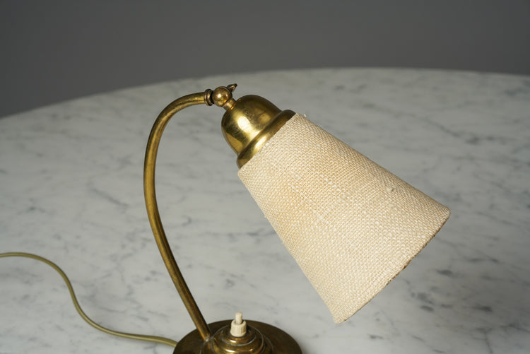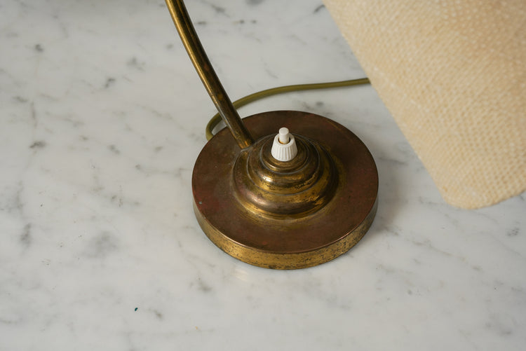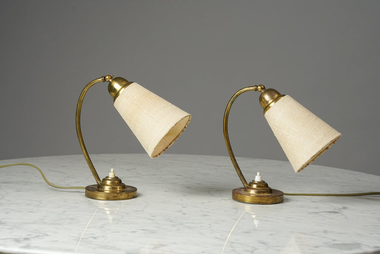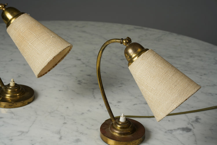 Upeat messinkiset pöytävalaisimet, kangasvarjostimet. Muistuttavat Itsun, sekä Idmanin malleja, tuntematon suunnittelija. Ajan patinaa.
