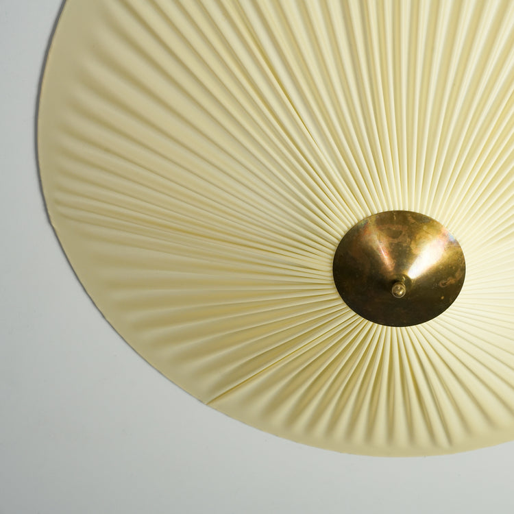 Plafondi, valmistettu Suomessa, 60-luku. Muovi varjostin, messinki yksityiskohdat. Hyvä kunto, pientä ajan patinaa.
