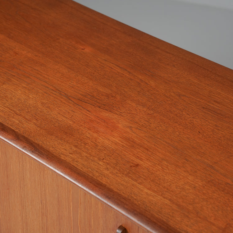 Laadukas senkki, valmistettu Tanskassa, 60-luku. Tiikkiä. Jalat tammea. Molemmilla sivuilla hyllyt. Keskellä alhaalla 8 laatikkoa ja ylhäällä hyllyjä. Hyvä kunto, pientä ajan patinaa.
